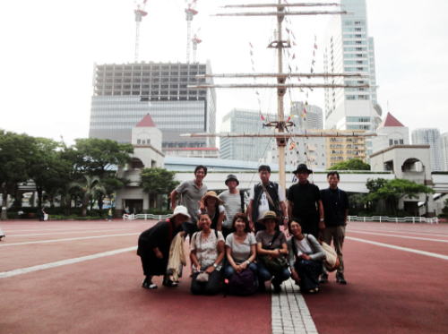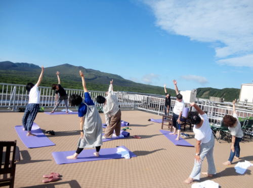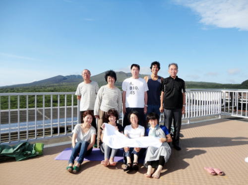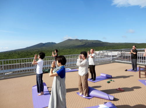 三原山をバックに壮大な景色の中で、持田先生のご指導のもと、早朝ヨガ。