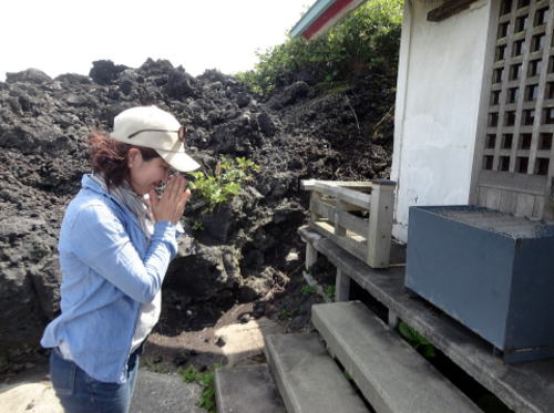 地球のパワーみなぎる雄大な活火山三原山を肌で感じながら、大噴火し流れ出た溶岩石の上を歩き、山頂に鎮座する三原神社を参拝。