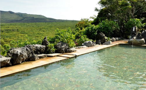 広大な樹海越しに、先ほど歩いた三原山内輪山や溶岩流を眺めながら源泉かけ流しの露天の湯に、疲労した身体は癒される。
